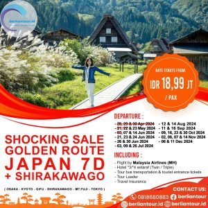 Hari 02: OSAKA – KYOTO - GIFU (X)Setelah sampai di Jepang, kita akan disambut guide yang ramah, setelah itu anda akan langsung diajak untuk mengunjungi mengunjungi Shinsaibasi – Dotonburi yang merupakan daerah pusat perbelanjaan yang iconic dengan papan iklan glico mannya. Kemudian, kita akan mengjungi Fushimi Inari yang merupakan kuil Shinto dan juga kuil pusat bagi sekitar 40.000 kuil Inari yang memuliakan Inari. Terakhir kita akan mengunjingi Kiyomizu Temple yang merupakan kuil Budha kuno yang dibangun sejak tahun 798 dan mengalami 10 kali kerusakan akibat perang dan bencana alam. Kemudian kita akan melakukan perjalanan ke Gifu, Check-in hotel istirahatBermalam di Hotel *** or similar